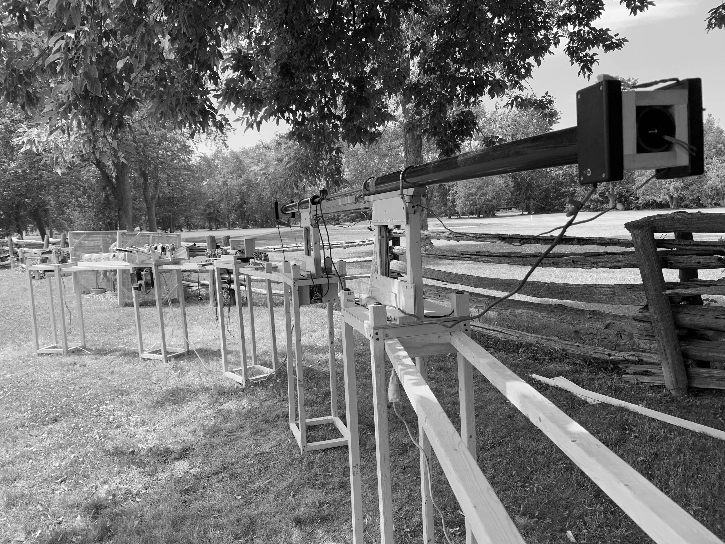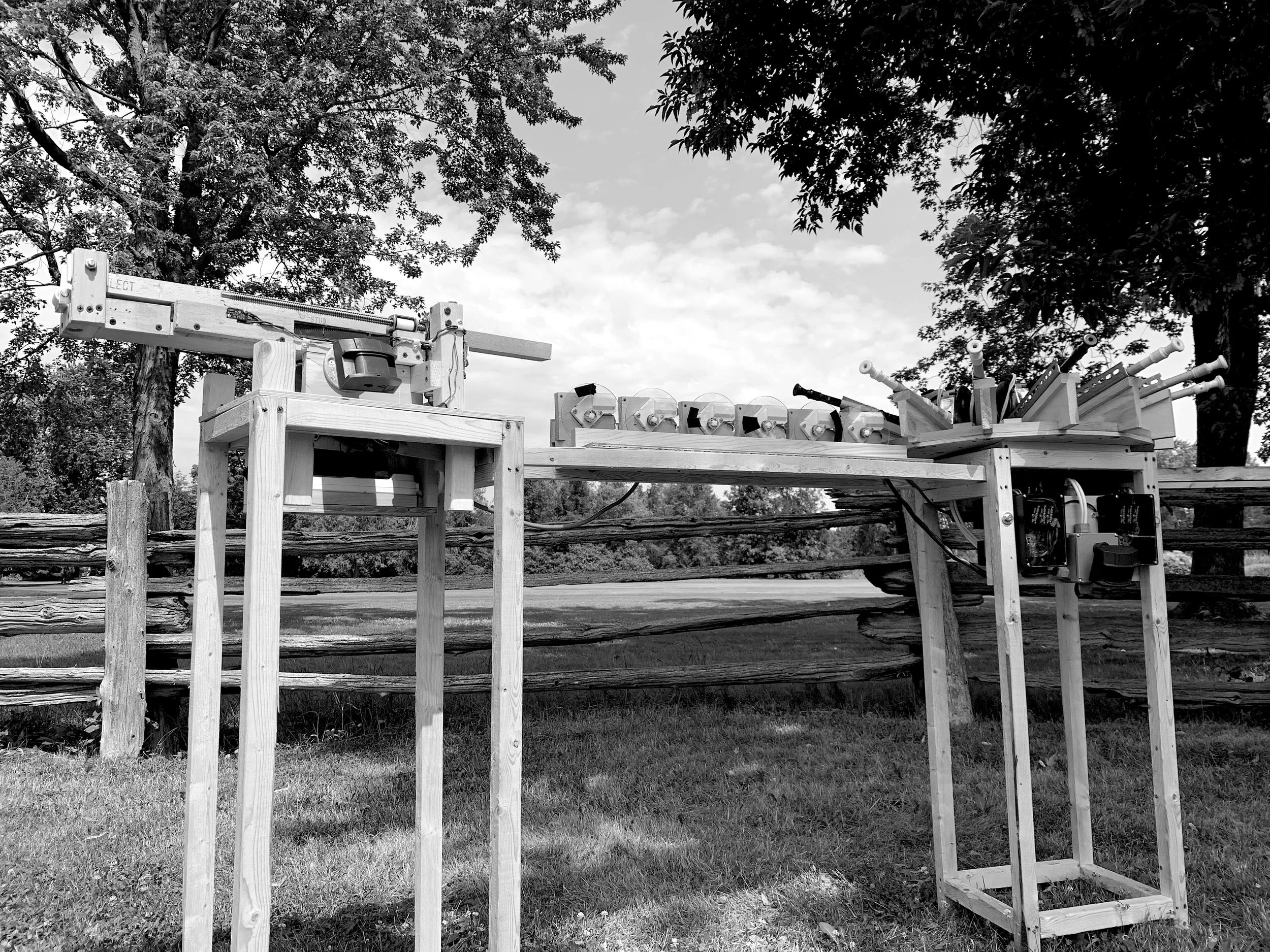 Sound Bridge is an electro-mechanical sound sculpture comprised of a number of sound and light emitting contraptions arrayed on a series of piers standing 4 feet high and 36 feet long. Motion sensors trigger the various sound/light events as visitors travel the length of the sculpture.